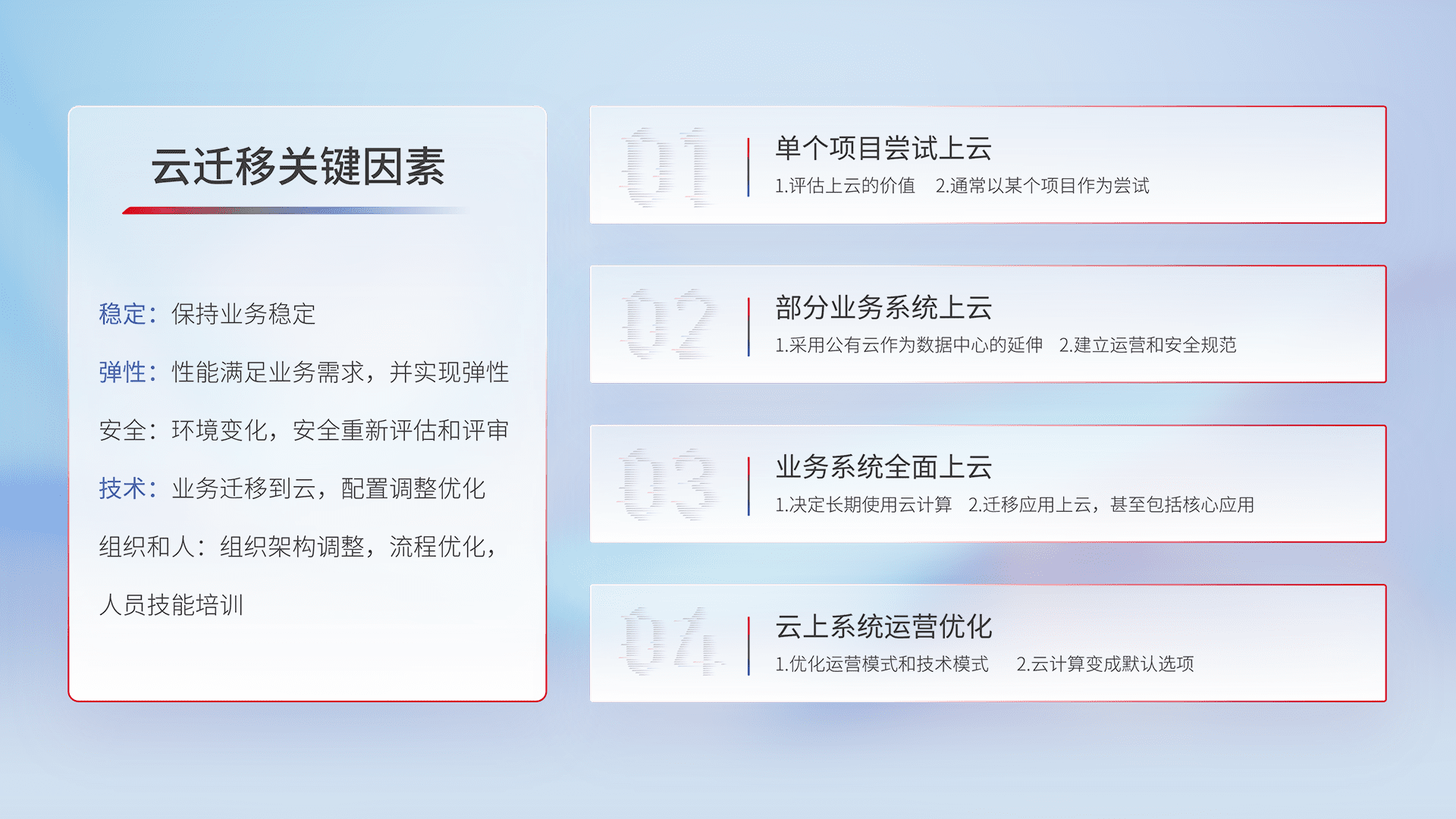 结合实际业务,,从规划设计、、、云平台选型、、、云原生改造、、、、数据迁移、、集成交付,,迁移全过程为客户识别最佳上云路径,,做好风险识别管理,,,设计网络架构、、身份权限、、、、安全审计合规、、操作审计、、日志审计、、、监控告警策略、、多站点容灾设计等,,,,对云上基础设施进行整体规划,,提升IT治理水平,,,以满足弹性、、、、高可用、、高性能的需求。。。。