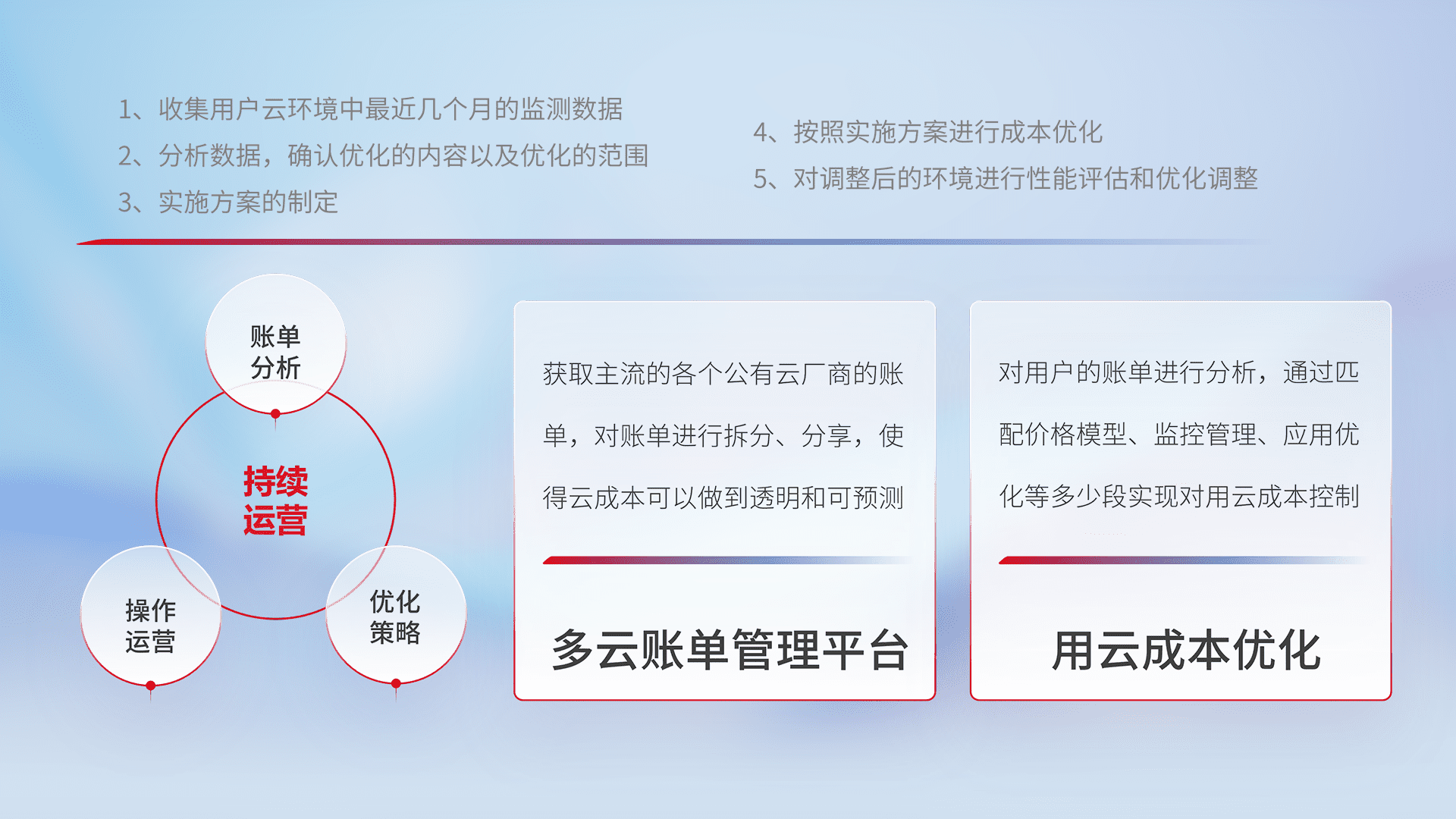 通过多云纳管,,,以统一的资源数据模型把客户的云资源进行抽象和封装,,进而实现对多云资源的统一操作,,,保障云资源管理的可靠性、、、、稳定性与可用性。。。。量身定制化运维内容,,配置、、开发运维、、、补丁管理、、、、备份、、、监控、、认证和访问管理、、、审计和日常巡检等,,,保障在用云过程中的可靠度,,,,稳定度以及高可用率。。