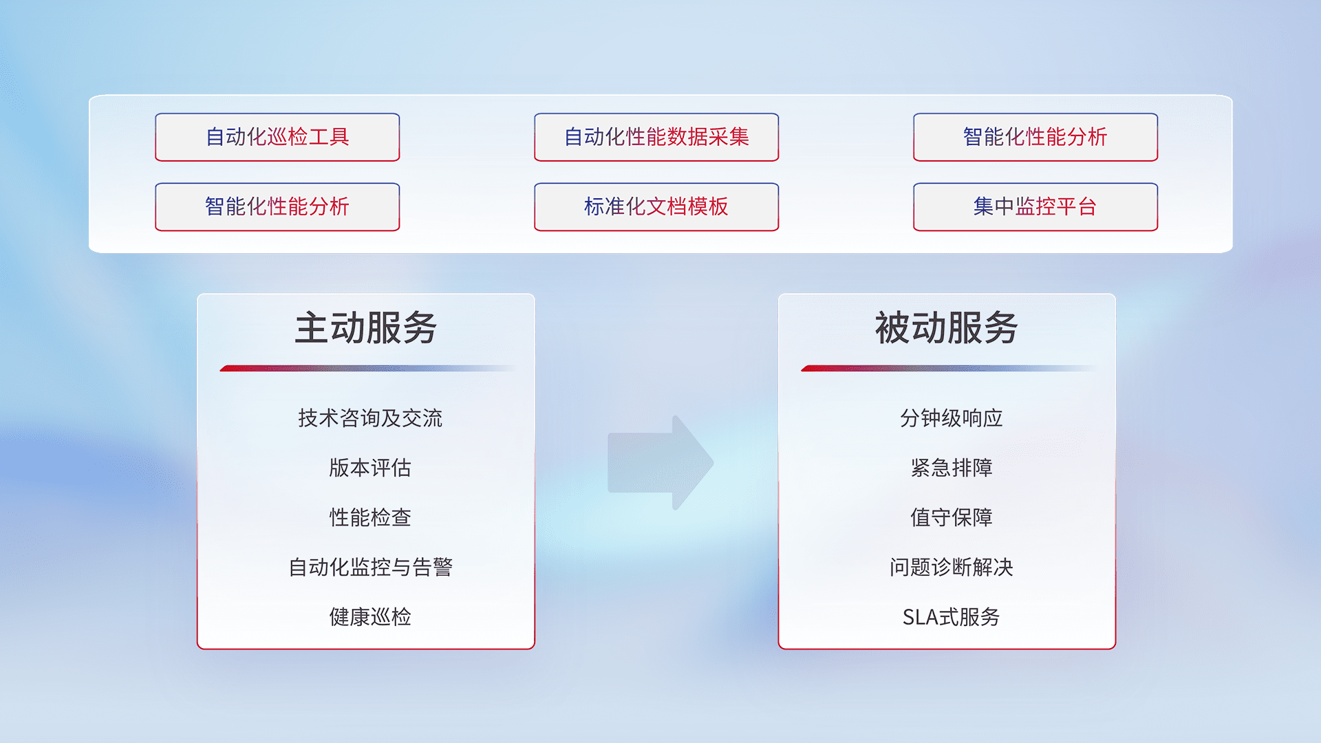 智能化工具和标准化文档,,,保障服务质量,,提供主动服务(包含技术咨询、、版本评估、、、、性能检查、、、自动化监控与告警、、、健康巡检)和被动服务包含(分钟级响应、、紧急排障、、值守保障、、、、问题诊断解决、、、SLA服务)。。